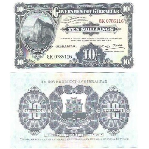 - Modelo: Gibraltar 10 Shillings 2018 P-41a Fe Comem (Reedição de 1934)
