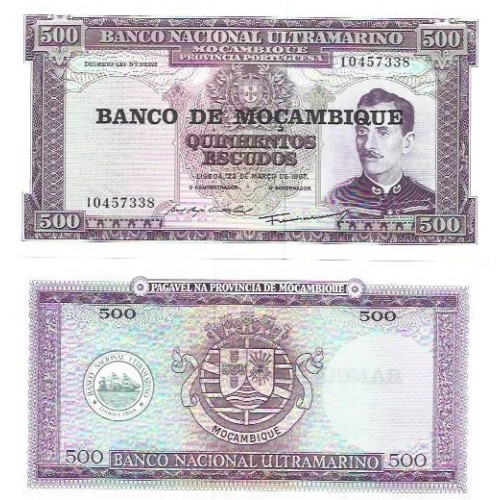 - Modelo: Moçambique 500 Escudos (1967) 1976 P-118a2 Fe (nr 8 digitos)